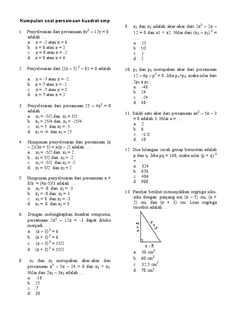 Persamaan kuadrat, sebuah konsep fundamental dalam matematika, seringkali menjadi batu loncatan penting bagi siswa SMP kelas 3 dalam memahami aljabar yang lebih kompleks. Materi ini tidak hanya menguji kemampuan pemecahan masalah, tetapi juga melatih pola pikir logis dan analitis. Memahami dan menguasai persamaan kuadrat adalah kunci untuk sukses di jenjang pendidikan selanjutnya. Namun, banyak siswa yang merasa kesulitan untuk memahami konsep ini secara mendalam, apalagi menemukan sumber latihan yang variatif dan relevan.